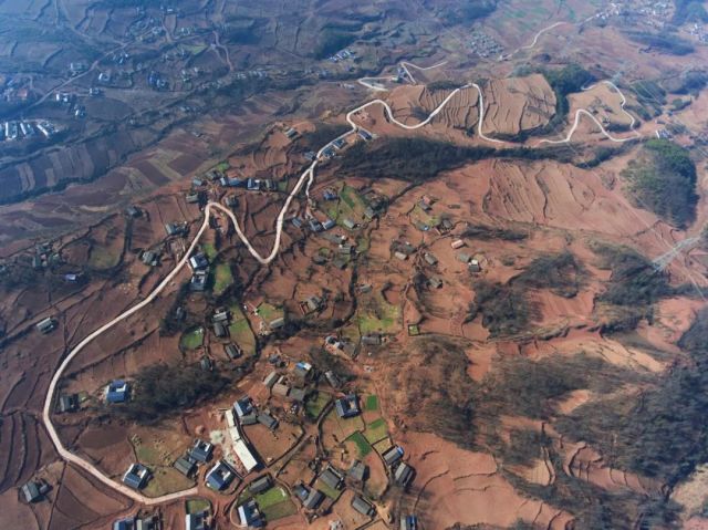 涼山彝族自治州美姑縣九口鄉(xiāng)四峨吉村6.3公里道路硬化項目從空中看來格外耀眼(2017年2月12日攝)。新華社記者劉坤攝