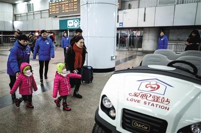 愛心扶助員幫助帶孩子的乘客乘坐愛心驛站電瓶車前往出租車等候區(qū)。
