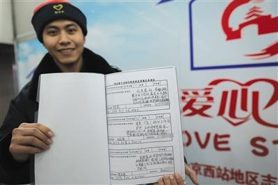 2月11日,北京西站北一出口外,愛心扶助員郭曉瀟向記者展示乘客們在留言簿上的留言。本版攝影/新京報(bào)記者 彭子洋