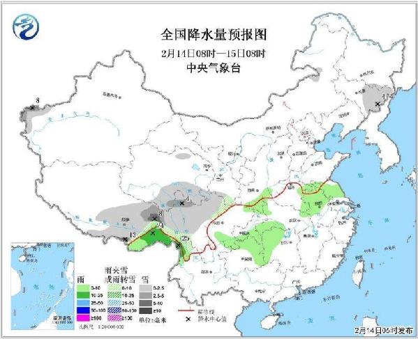 全國降水量預(yù)報圖(2月14日08時-15日08時)