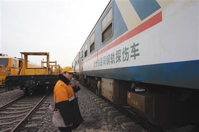 昨日,工作人員正在對(duì)鋼軌探傷車進(jìn)行調(diào)試。新京報(bào)記者 王貴彬 攝