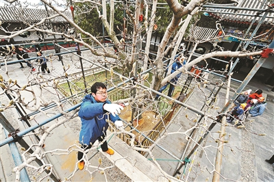 “為了修剪一棵樹而專門搭起腳手架,所做功夫之細(xì),這在北京城里也是較為少見的?!鳖U和園古樹管護(hù)中心負(fù)責(zé)人韓紅巖說,其目的是盡最大努力保護(hù)古樹。如果用梯子,移動(dòng)的時(shí)候容易把花苞碰掉,損壞枝條。樹冠深處的一些花苞也夠不著,存在修剪死角。頤和園采用搭腳手架這種獨(dú)有的修剪方式,所有問題也就迎刃而解了。
