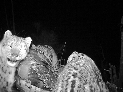 當(dāng)人們趕到后,雪豹已經(jīng)不在現(xiàn)場。于是,工作人員在牦牛尸體附近的樹上布下了兩臺(tái)紅外相機(jī),捕捉到了前面所述的畫面。“我們在安裝機(jī)器時(shí),雪豹就在二十米開外的一塊巨石背后,我看到了它放光的眼睛。”