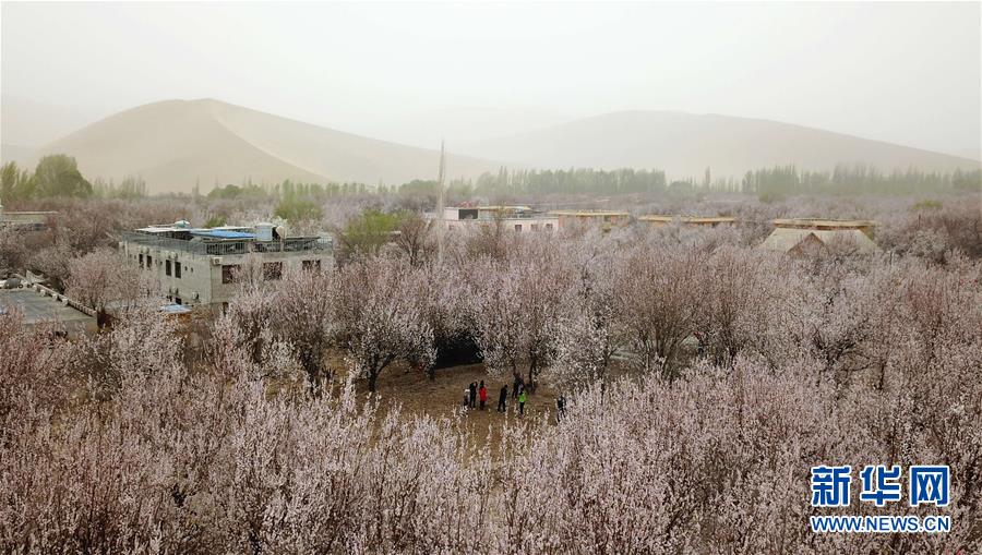 3月28日,游客在敦煌鳴沙山下的李廣杏園內(nèi)賞花。近日,甘肅省敦煌市鳴沙山下8000多畝李廣杏花競(jìng)相開(kāi)放,吸引了眾多游客和市民踏青賞花。 新華社記者陳斌攝