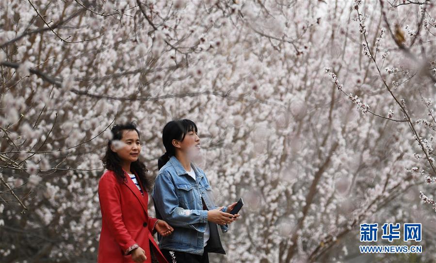 3月28日,游客在敦煌鳴沙山下的李廣杏園內(nèi)賞花。近日,甘肅省敦煌市鳴沙山下8000多畝李廣杏花競(jìng)相開放,吸引了眾多游客和市民踏青賞花。 新華社記者陳斌攝