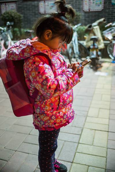 1月19日,在濟(jì)南實驗初中校門外,一位和姑姑來等表姐放學(xué)的小女孩,背著幼兒園的小書包,站在那里低頭聚精會神地玩著姑姑的手機(jī)。