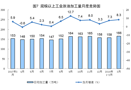 受去年下半年國內新增煉化產(chǎn)能陸續(xù)投產(chǎn)和2018年首批原油進口配額大幅增加影響,一季度原油加工量明顯增長,同比增長7.5%,增速比去年同期加快3.0個百分點。3月份,原油加工量同比增長8.3%,日均加工166.2萬噸,為歷史最高水平。其中,汽油、煤油和柴油產(chǎn)量分別增長5.7%、14.6%和1.3%。