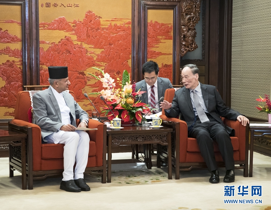 王岐山表示,中尼交往源遠流長,是經(jīng)過歷史檢驗的好鄰居、好朋友。在兩國領(lǐng)導(dǎo)人共同引領(lǐng)下,中尼關(guān)系持續(xù)健康發(fā)展,各領(lǐng)域合作穩(wěn)步推進。中國改革開放和社會主義現(xiàn)代化建設(shè)中,一條很重要的經(jīng)驗是處理好穩(wěn)定與發(fā)展的關(guān)系,穩(wěn)定是發(fā)展的前提,發(fā)展是穩(wěn)定的基礎(chǔ)。中方高興看到尼泊爾完成政治轉(zhuǎn)型,將國家建設(shè)重心轉(zhuǎn)移到發(fā)展經(jīng)濟上來,支持尼保持團結(jié)穩(wěn)定,實現(xiàn)發(fā)展目標。希望雙方共同落實好已有共識和協(xié)議,以“一帶一路”建設(shè)為契機拓展全方位合作,推動兩國關(guān)系發(fā)展到新高度。