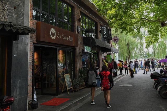 游客從“初心”咖啡館的門前經過??拷贾菽仙铰返摹俺跣摹笨Х瑞^以前是“東籬會所”,如今成了別有風味的大眾咖啡館。新華社記者 黃宗治 攝