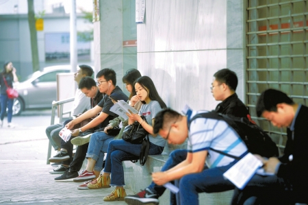 4月21日,在四川省公招公務(wù)員考點外,應(yīng)考者正在抓緊時間復(fù)習(xí)備考。
