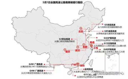 5月1日,全國高速路易擁堵緩行路段。來自交通部路網(wǎng)中心微信公號(hào)。