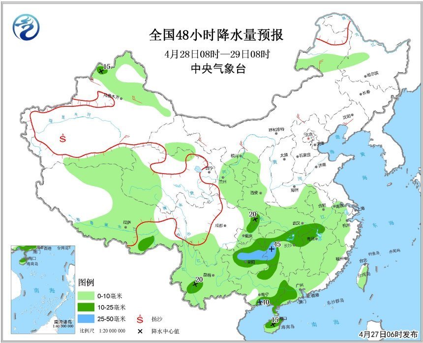 北方地區(qū),以多云為主。不過,29日,華北地區(qū)北部、東北地區(qū)中南部將有小雨或陣雨。5月1日,內(nèi)蒙古東部、東北地區(qū)中南部、黃淮、華北南部有小到中雨。上述部分地區(qū)伴有雷電等強對流天氣。4月29日,京津冀中南部地區(qū)有霾。30日,隨著冷空氣的到來,霾會逐漸減弱消散。