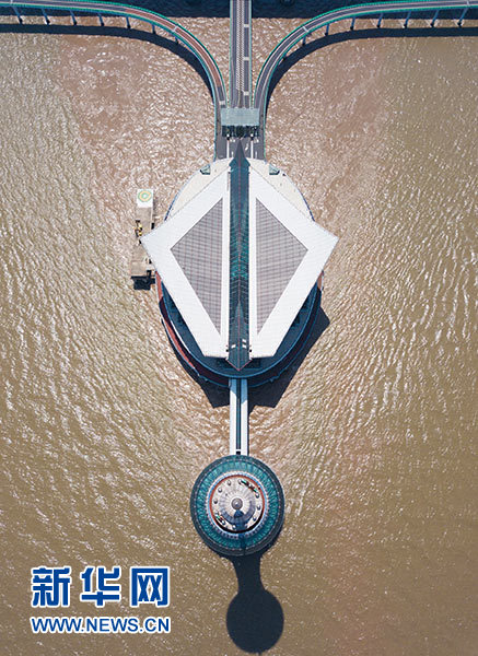 鳥(niǎo)瞰杭州灣跨海大橋海上觀光服務(wù)平臺(tái)(4月19日無(wú)人機(jī)航拍)。新華社記者 翁忻旸 攝