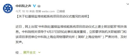近日,網(wǎng)上出現(xiàn)“中科院釷基熔鹽堆核能系統(tǒng)項目啟動儀式上道士做法驅(qū)邪”相關(guān)信息。中科院相關(guān)領(lǐng)導(dǎo)于4月27日獲知此事后高度重視,立即要求院機關(guān)職能部門和該項目承擔(dān)單位中科院上海應(yīng)用物理研究所(簡稱“上海應(yīng)物所”)嚴(yán)肅對待、及時發(fā)聲。