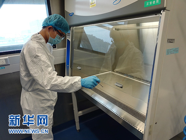 中國科學(xué)院武漢病毒研究所暖通設(shè)備工程師王亮在武漢P4實(shí)驗(yàn)室測試設(shè)備(資料照片)。 新華社發(fā)