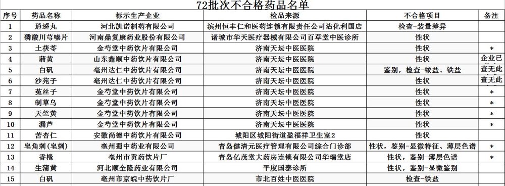 山東省食藥監(jiān)局今天發(fā)布第5期藥品、中藥飲片抽檢結(jié)果,72批次藥品質(zhì)量抽檢不合格。