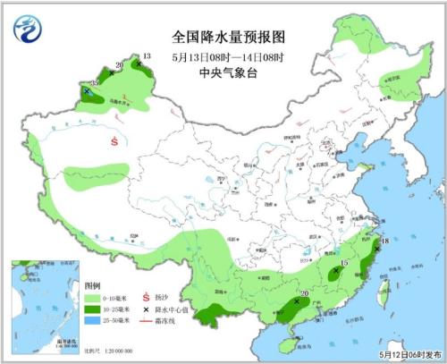 5月13日08時(shí)至14日08時(shí),江南大部、華南、西南地區(qū)中南部、新疆北疆地區(qū)、黑龍江東部和北部等地有小到中雨,其中,新疆伊犁河谷局地有大雨,上述局部地區(qū)將伴有雷暴大風(fēng)、短時(shí)強(qiáng)降水等強(qiáng)對流天氣。華北西部、西北地區(qū)東北部、內(nèi)蒙古中東部、新疆北部等地的部分地區(qū)有4~6級風(fēng),新疆南疆盆地局地有揚(yáng)沙或浮塵(見圖2)。