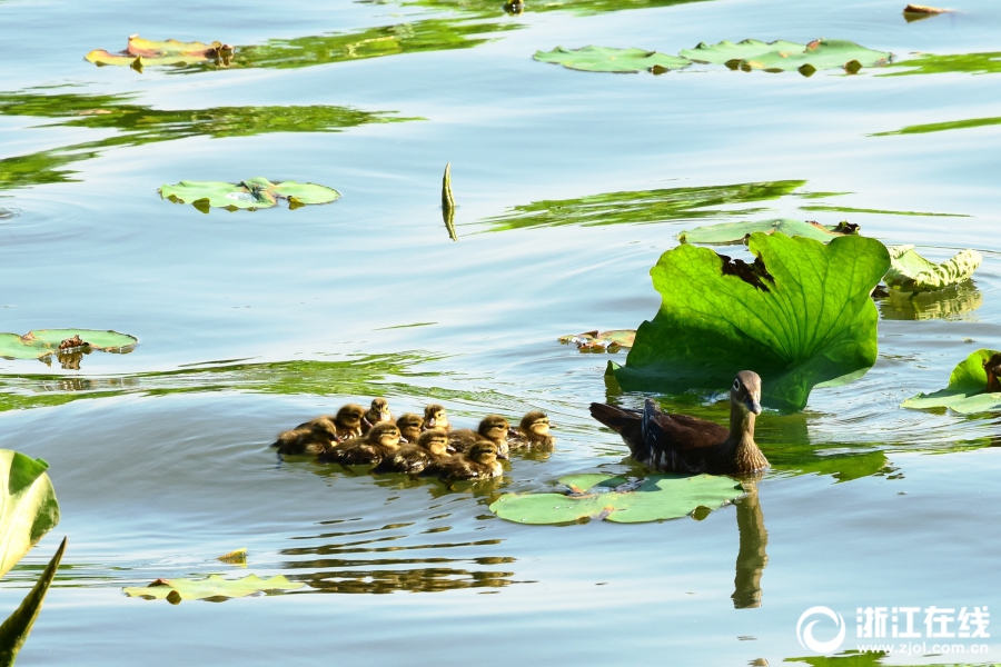 5月15日,西湖斷橋荷塘出現(xiàn)了今年第4窩小鴛鴦,此次共10只。與西湖第1窩時的獨(dú)苗相比,此窩可算是一個大家庭, 這讓鴛鴦媽媽忙不過來了。(浙江在線拍友 里爾 攝)
