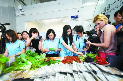 昨天(15日)上午,北京航空航天大學(xué)“月宮一號”實(shí)驗(yàn)室,為期365+5天的世界上時間最長的“月宮365”實(shí)驗(yàn)獲得圓滿成功。左圖:4位志愿者從實(shí)驗(yàn)艙走出。上圖:從全密閉實(shí)驗(yàn)艙中帶出的蔬果吸引了眾人的目光。本報記者 和冠欣攝