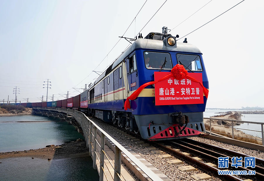 發(fā)往比利時(shí)安特衛(wèi)普的國(guó)際集裝箱班列從河北唐山港京唐港區(qū)駛出(4月26日攝)。唐山港京唐港區(qū)當(dāng)日正式開(kāi)通中歐國(guó)際集裝箱班列。新華社記者 楊世堯 攝