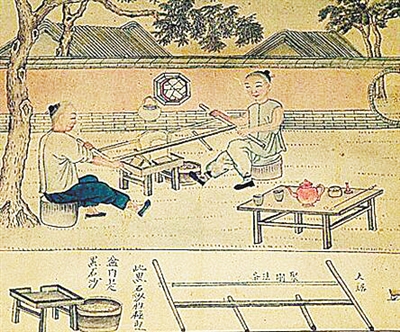清代李澄淵在光緒十七年(1891年)應(yīng)英國醫(yī)士畢索普要求畫了一組《玉作圖》?!队褡鲌D》細(xì)致描繪了從搗沙研漿、開玉、解玉、粗磨、細(xì)磨、掏膛、磨琢紋飾等到最后拋光的各個(gè)制作環(huán)節(jié)的場景。