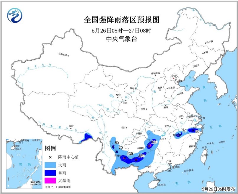 中央氣象臺預(yù)計,26日8時至27日8時,浙江中部、江西北部、湖南西部、貴州東部和南部、廣西中西部、云南東部和南部、四川南部等地的部分地區(qū)有大到暴雨,其中,湖南西南部、貴州東部、廣西西北部、云南東部局地有大暴雨(100~130毫米);上述部分地區(qū)并伴有短時強降水、雷暴大風等強對流天氣,最大小時降水量40~60毫米。中央氣象臺5月26日6時繼續(xù)發(fā)布暴雨黃色預(yù)警。