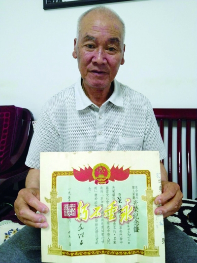 董存金手捧哥哥董存瑞烈士“光榮犧牲,永垂不朽”的紀(jì)念證