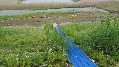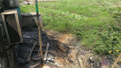 一家縣城周邊的農(nóng)莊,餐廚污水、廢棄物長時間排放到一個小水塘,堆滿了黑色或黃色的濕乎乎、粘稠狀污物,旁邊緊鄰著稻田和一條灌溉水渠。記者 白田田 攝