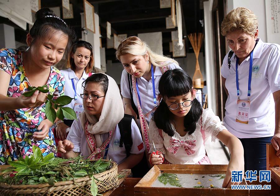 2017年8月15日,“魅力非遺——第二屆上海合作組織夏令營·非物質文化遺產(chǎn)交流體驗”活動在貴州省黔東南苗族侗族自治州丹寨縣萬達小鎮(zhèn)舉行。這是外國手工藝人在古法造紙體驗館了解花草紙的制作過程。新華社發(fā)(黃曉海 攝)