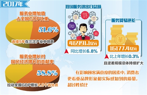 服務(wù)業(yè)是現(xiàn)代化經(jīng)濟(jì)體系建設(shè)的關(guān)鍵領(lǐng)域。統(tǒng)計(jì)數(shù)據(jù)顯示,2017年,服務(wù)業(yè)增加值占全國GDP比重為51.6%,連續(xù)5年在三次產(chǎn)業(yè)中領(lǐng)跑,服務(wù)業(yè)增長對(duì)國民經(jīng)濟(jì)增長的貢獻(xiàn)率為58.8%,拉動(dòng)全國GDP增長4.0個(gè)百分點(diǎn)。