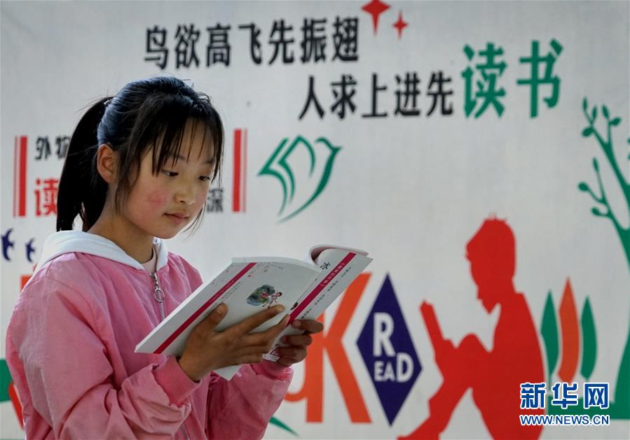 河南焦作市博愛(ài)縣寨豁鄉(xiāng)小學(xué)學(xué)生郭艷冰在校內(nèi)閱讀從“焦作市圖書(shū)館館外流通點(diǎn)”借閱的書(shū)籍(4月18日攝)。新華社記者 李安 攝