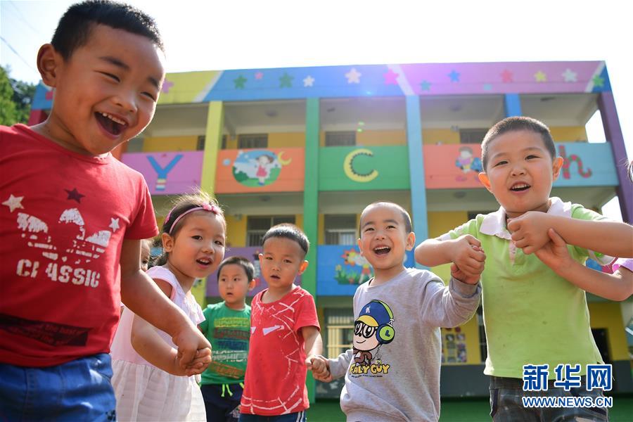 陜西省安康市漢濱區(qū)雙龍鎮(zhèn)杜壩村五四小學(xué)附設(shè)幼兒園小朋友們?cè)诓賵?chǎng)上做游戲(2017年6月16日攝)。這個(gè)幼兒園使用貸款資金翻修改造而成,有效解決了該村及周邊兒童學(xué)前教育缺失的問(wèn)題。新華社記者 邵瑞 攝