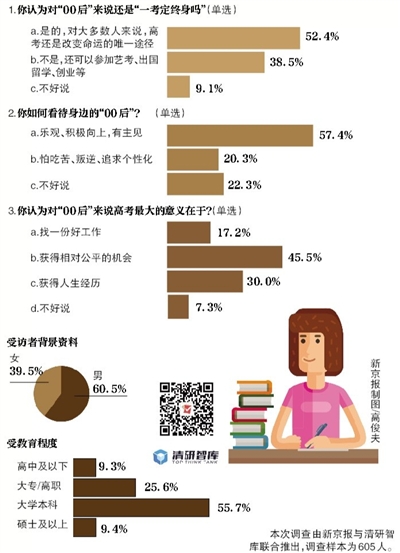 一年一度的高考剛剛落下帷幕。據(jù)教育部統(tǒng)計(jì),今年全國(guó)共有975萬(wàn)名考生參加高考,人數(shù)創(chuàng)下最近8年來(lái)的新高,比去年增加了35萬(wàn)人。值得注意的是,今年參加高考的學(xué)生,大多也是在2000年出生的“千禧寶寶”。雖然說(shuō)起來(lái),其實(shí)所謂的“00后”,跟“80后”、“90后”,以及任何一種“后”,本質(zhì)上都沒(méi)有什么區(qū)別。在高考面前,在人生的關(guān)口面前,他們都是命運(yùn)的“考生”。但是,時(shí)代不同,一代人也自有一代人不同的際遇。對(duì)此,我們需要關(guān)注什么?本期“京報(bào)調(diào)查”(新京報(bào)與清研智庫(kù)聯(lián)合推出)就此展開調(diào)查。