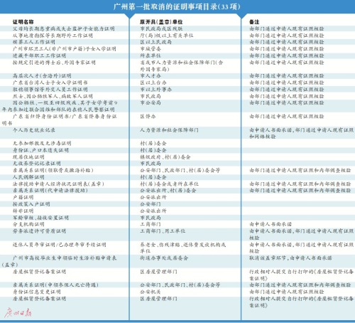 據(jù)悉,廣州自去年10月起已啟動(dòng)“減證便民”專項(xiàng)工作,由市編辦牽頭,會(huì)同市法制辦、市政務(wù)辦對(duì)市政府各部門的證明事項(xiàng)進(jìn)行梳理審核。經(jīng)研究,市政府第一批取消7個(gè)部門共33項(xiàng)證明事項(xiàng),其中市教育局13項(xiàng)、市人力資源社會(huì)保障局10項(xiàng)、市公安局4項(xiàng)、市司法局3項(xiàng)、市民政局1項(xiàng)、市交委1項(xiàng)、市食品藥品監(jiān)管局1項(xiàng)。