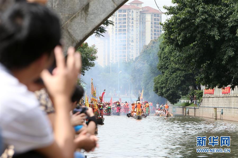 6月14日,觀眾在廣州市天河區(qū)一處河道旁等待龍舟通過(guò)。當(dāng)日,廣州市天河區(qū)舉行一場(chǎng)熱鬧歡快的龍舟活動(dòng),來(lái)自多個(gè)村莊“走親戚”的龍舟隊(duì)參加。按廣州的傳統(tǒng)習(xí)俗,每年農(nóng)歷五月初一至初五,各村的龍舟隊(duì)要到周?chē)迓洹白哂H戚”。走親戚的龍舟隊(duì)到來(lái)時(shí),受訪村子要準(zhǔn)備好龍舟飯招待來(lái)客。活動(dòng)當(dāng)天,鳴炮敲鑼,一派喜慶氣氛。新華社記者 張加揚(yáng) 攝