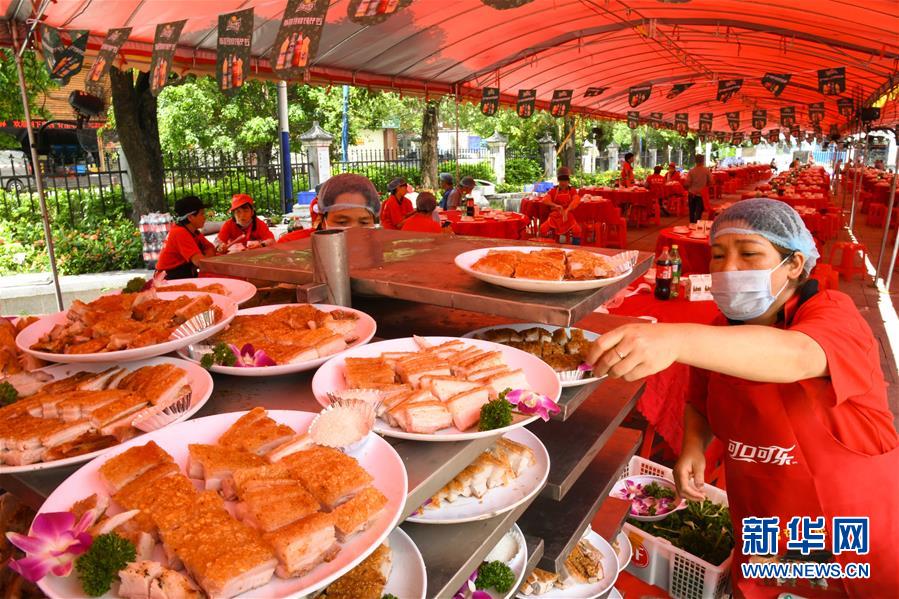 6月14日,工作人員在廣州天河區(qū)珠村七夕廣場準備龍舟飯。當日,廣州市天河區(qū)舉行一場熱鬧歡快的龍舟活動,來自多個村莊“走親戚”的龍舟隊參加。按廣州的傳統(tǒng)習俗,每年農(nóng)歷五月初一至初五,各村的龍舟隊要到周圍村落“走親戚”。走親戚的龍舟隊到來時,受訪村子要準備好龍舟飯招待來客。活動當天,鳴炮敲鑼,一派喜慶氣氛。新華社記者 鄧華 攝