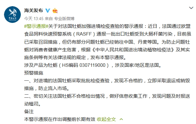 海關(guān)總署警示通報(bào)稱,近日,法國通過歐盟食品飼料快速預(yù)警系統(tǒng)(RASFF)通報(bào)一批出口牡蠣受到大腸桿菌污染,目前雖已采取召回措施,但仍有部分問題牡蠣已經(jīng)銷往中國、丹麥等國。