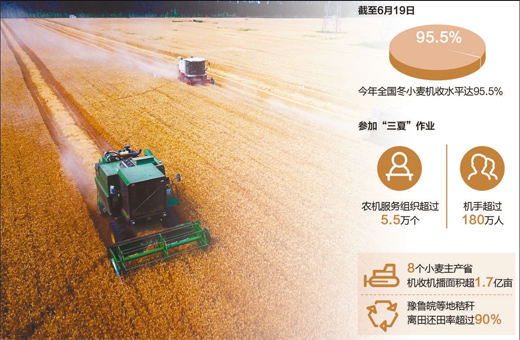 據(jù)農(nóng)業(yè)農(nóng)村部統(tǒng)計(jì),今年全國(guó)參加“三夏”作業(yè)的農(nóng)機(jī)服務(wù)組織預(yù)計(jì)超過5.5萬個(gè),機(jī)手超過180萬人,截至6月19日,全國(guó)冬小麥機(jī)收水平達(dá)到95.5%,8個(gè)小麥主產(chǎn)省機(jī)收、機(jī)播服務(wù)面積超過1.7億畝。全程機(jī)械化特點(diǎn)明顯,各地主推“一條龍”作業(yè),在搶收小麥的同時(shí),玉米機(jī)播隨即展開,夏收、夏種、夏管這“三夏”正在變成“兩夏”。