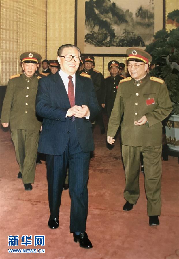 1990年12月,趙南起同志陪同江澤民同志接見全軍后勤工作會議代表。新華社發(fā)
