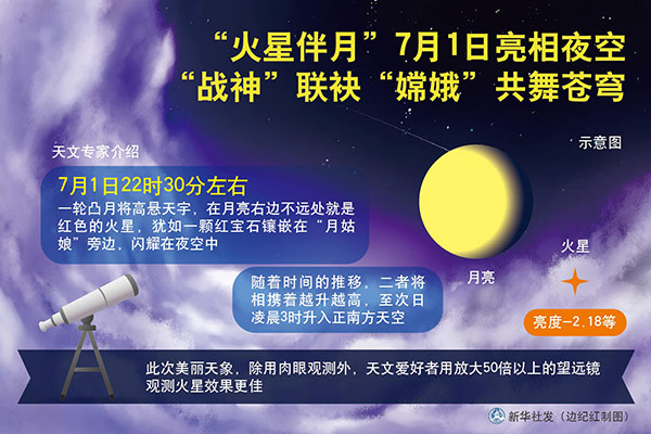 圖表:“火星伴月”7月1日亮相夜空 “戰(zhàn)神”聯(lián)袂“嫦娥”共舞蒼穹 新華社發(fā) 邊紀紅 制圖