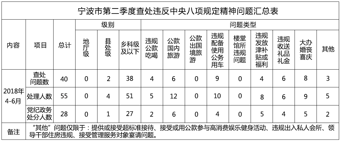 2018年4至6月,寧波市各級(jí)紀(jì)檢監(jiān)察機(jī)關(guān)共查處違反中央八項(xiàng)規(guī)定精神問題40起,處理55人,其中給予黨紀(jì)政務(wù)處分28人。