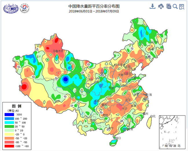 2018年6月1日-7月9日全國(guó)降水量距平百分率分布圖。