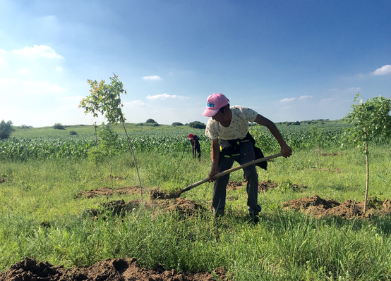 一路上,看到有幾十個(gè)村民在林地里忙碌著植樹。先是用鐵鍬在土地里刨坑,然后把帶有土壤的樟子松或五角楓樹放在刨好的坑里栽上。在長(zhǎng)時(shí)間強(qiáng)烈的日照下,盡管他們戴著太陽帽,或穿戴嚴(yán)實(shí)、裹著頭巾,皮膚照樣曬得黝黑。村民告訴記者,因?yàn)椴挥萌ネ獾卮蚬?,可以在自己家的地盤上種樹,有收入,雖然苦點(diǎn),還是很幸福的。