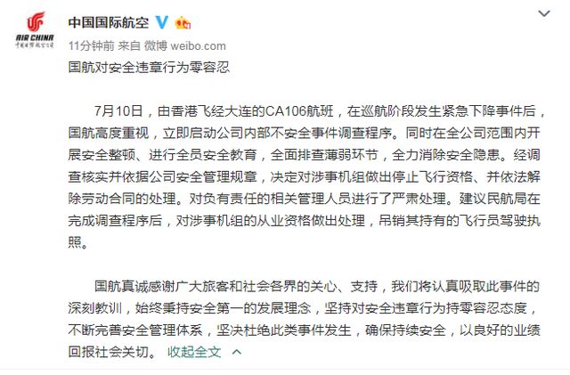 國航方面11日通過其官方微博回應稱,目前機組正在接受中國民用航空局相關(guān)部門的調(diào)查,如果調(diào)查發(fā)現(xiàn)機組存在違章違規(guī)行為,公司將以零容忍的態(tài)度對責任人嚴肅處理。2018-07-11 22:19:03