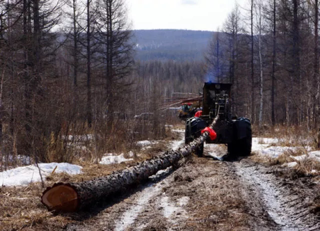 2015年3月28日,內(nèi)蒙古大興安嶺圖里河林業(yè)局砍伐的最后一段木材被運下山 鄒儉樸/攝