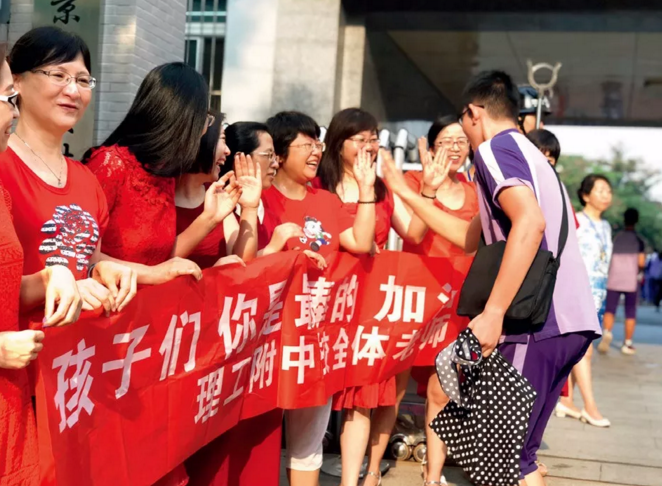 ▲ 6月24日,北京理工大學附屬中學分??键c外,初三老師與考生擊掌,為其加油鼓勁 蔡文玲攝