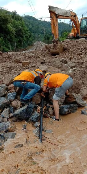 14日凌晨3點,經(jīng)過將近3小時、8公里的徒步行走,劉金樂終于到達橫現(xiàn)河水害處所。他二話不說,拿起鐵鍬帶領大家清理排水溝,用礦泉水瓶、棉紗清理箱盒內(nèi)部積水。