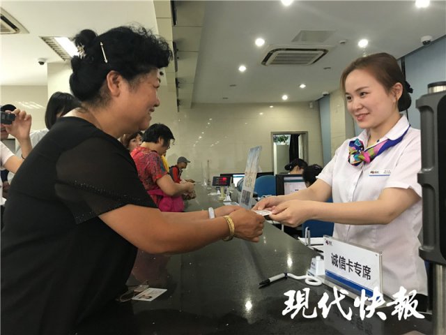 7月11日上午10點,南京市熙南里智匯營業(yè)廳,市民周萍站到達一個特殊的窗口—— " 誠信卡專席"。在這里,她持有的市民卡將進行升級,變身"市民誠信卡"。