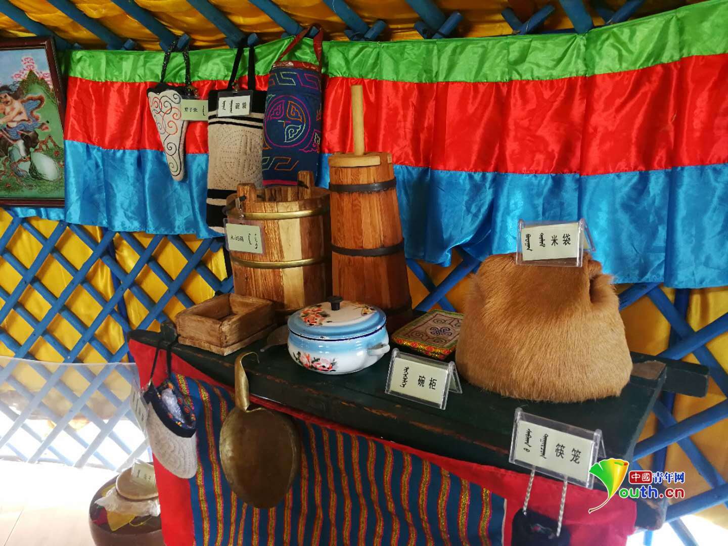 為了讓自家的旅游服務(wù)做的更好,蘇·呼格吉勒圖專門設(shè)計了一個獨特的蒙古包“展廳”,里面全是牧民生產(chǎn)工具和生活用品:接羊羔的氈口袋、做酸奶的竹筒、弓箭、燭臺、皮口袋、搖籃等等。作為一個熱愛傳統(tǒng)民俗的牧人,蘇.呼格吉勒圖把這些帶有蒙古族文化元素的“寶貝”一一收集起來,讓每一位來到這里的游客都能親身體驗到傳統(tǒng)游牧文化的魅力。