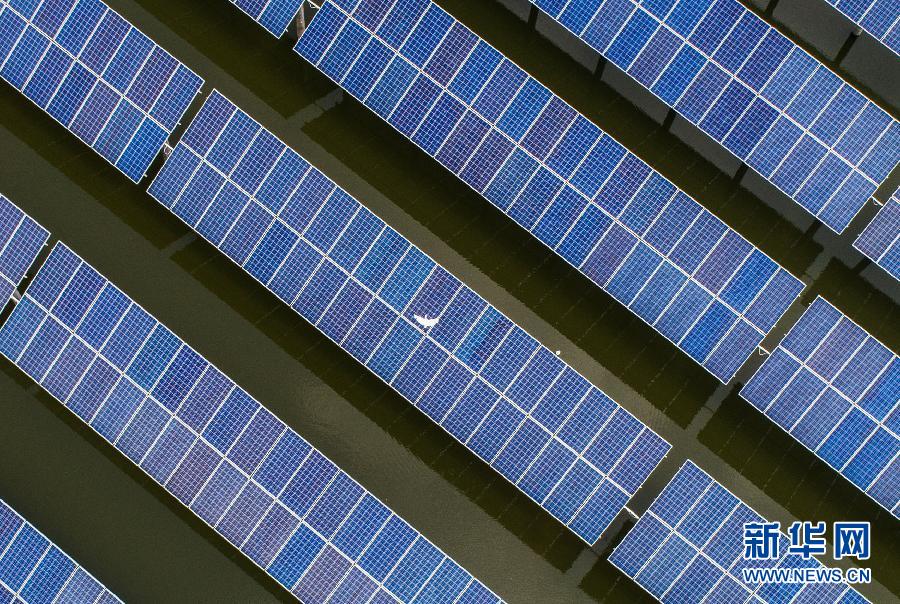 一只白鷺從光伏板上飛過(6月21日攝)。浙江省湖州市和孚鎮(zhèn)的“漁光互補(bǔ)”光伏發(fā)電項目建設(shè)在4200多畝魚塘上,40多萬塊太陽能光伏板下養(yǎng)殖小龍蝦和青蝦等水產(chǎn),千畝魚塘與綠色光伏電站構(gòu)成一幅和諧的生態(tài)美景圖。 新華社記者 徐昱 攝